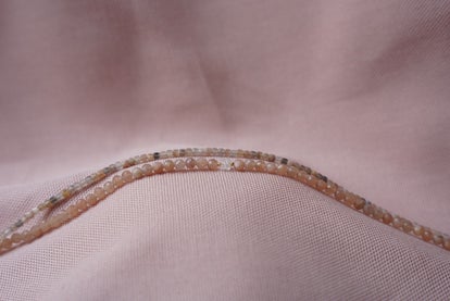 Ketting 2: 45 cm – een iets langere ketting die prachtig gecombineerd kan worden voor een gelaagd effect. In deze ketting is extra detail toegevoegd in de vorm van 2 chipsteentjes regenboog maansteen. €34,95