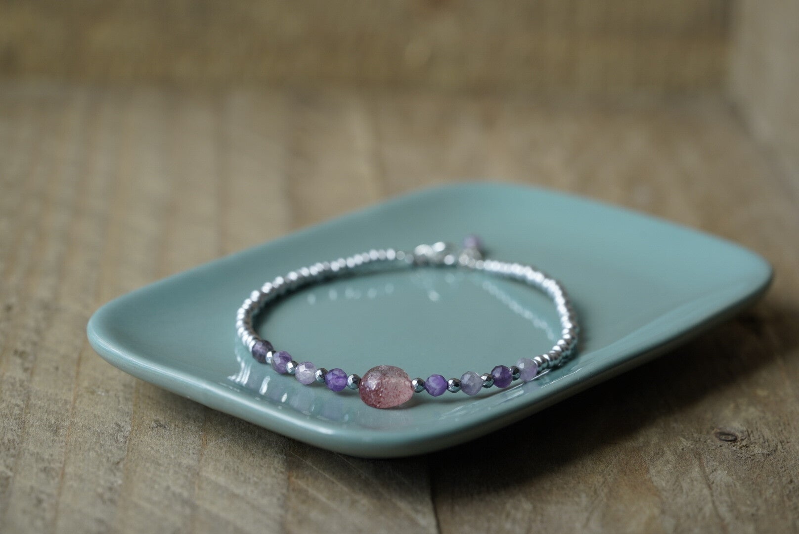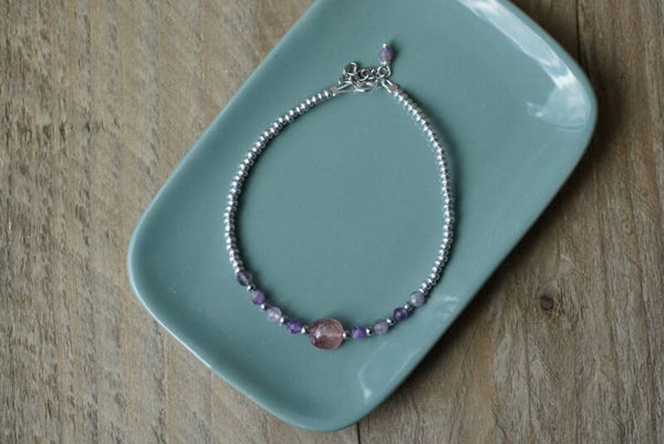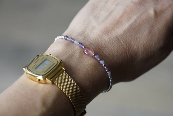 Een armbandje gemaakt van zilverrn miyuki kraaltjes, amethyst en strawberry quarts. Zie je liever een andere stenen/kleuren combinatie. Dat kan! Neem dan Contact op.