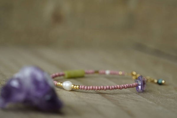 Een armbandje gemaakt van myuki kraaltjes gecombineerd met groene jade, amethyst en zoetwaterparel. Hier en daar een gouden hematietkraaltje. Wat een zomers armbandje is dit!