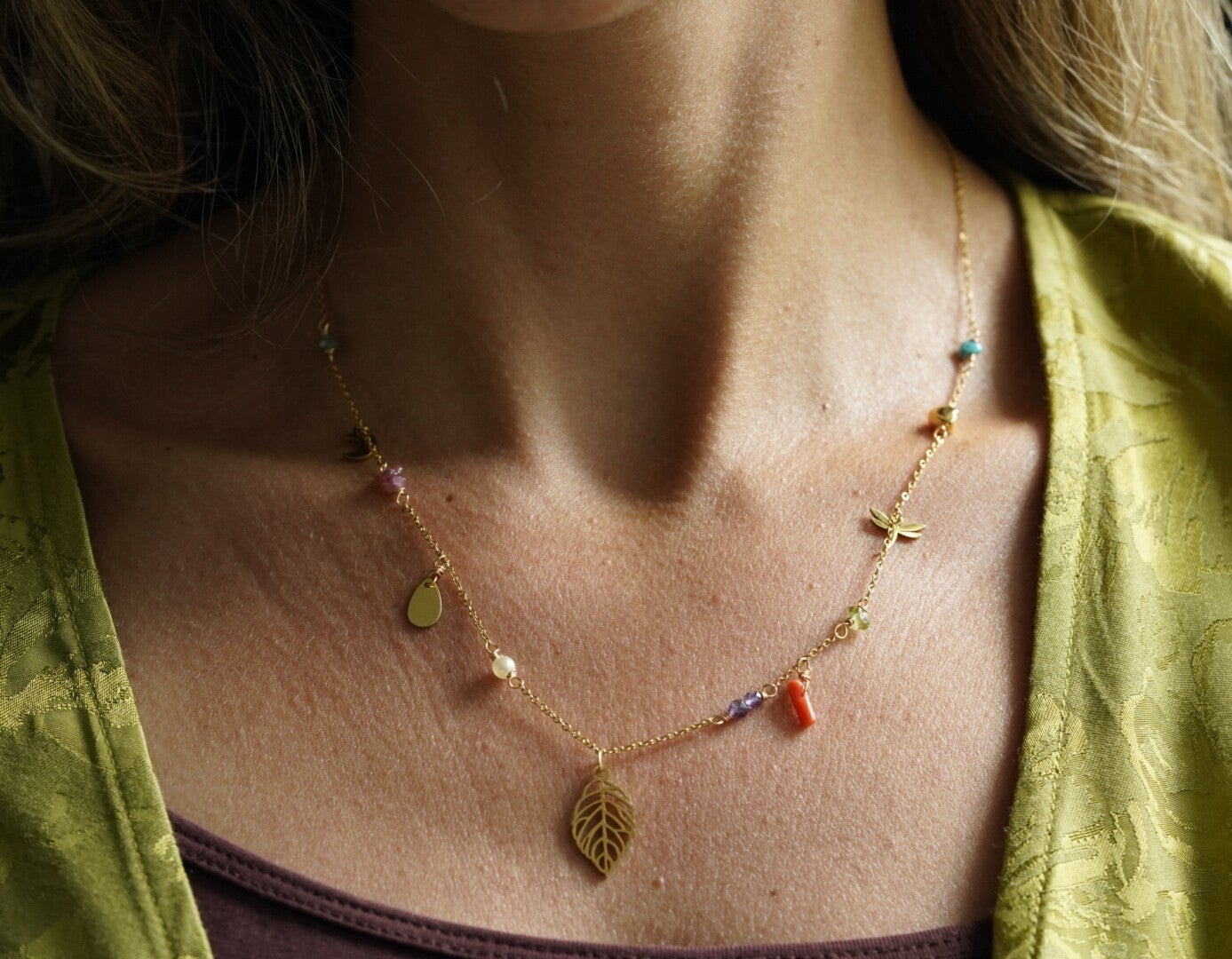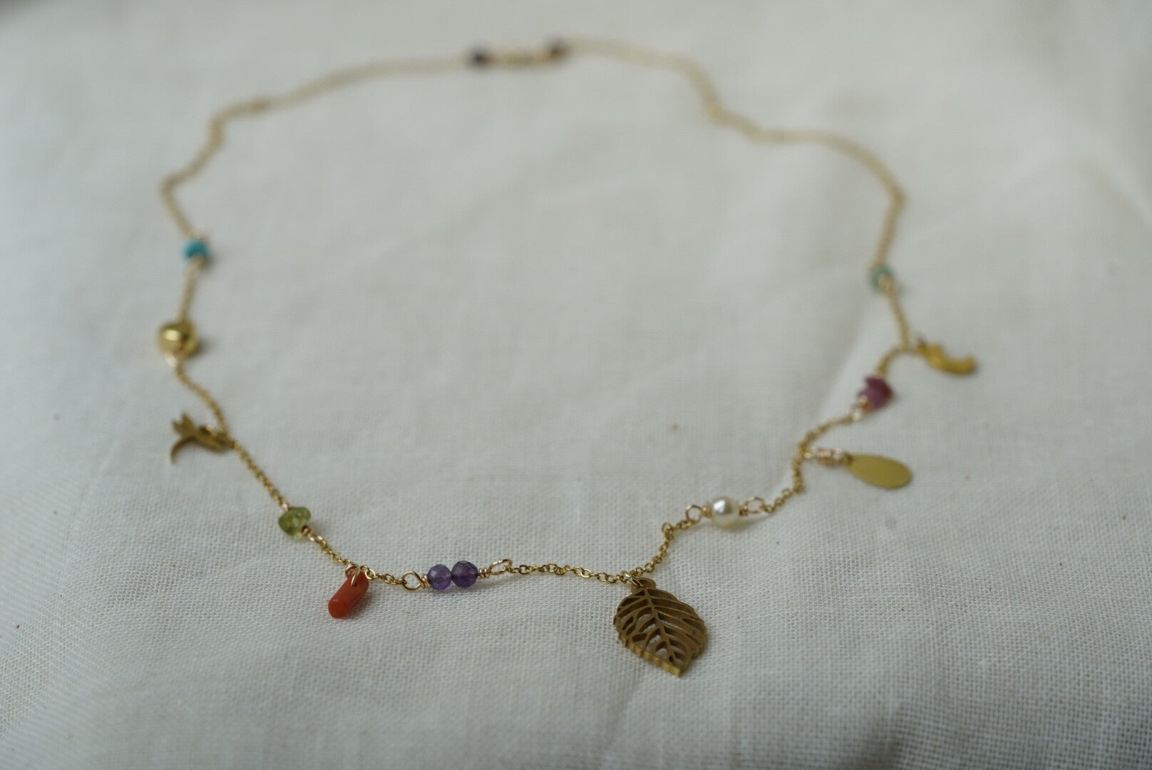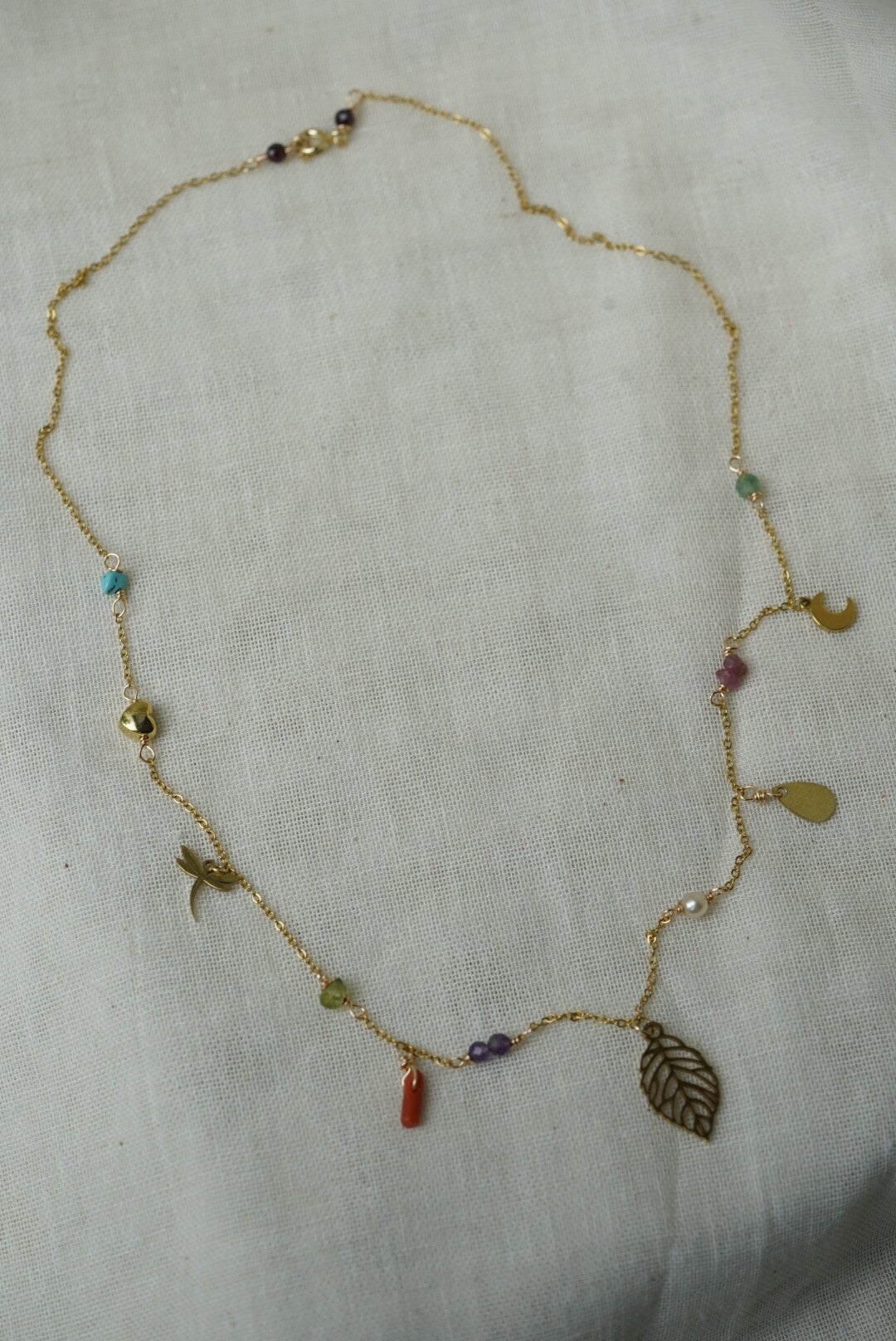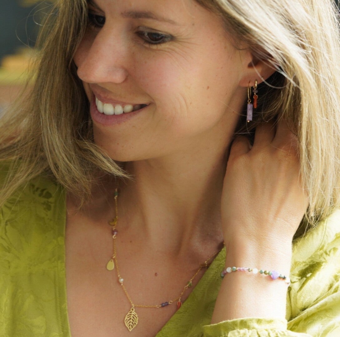 De edelstenen die ik gebruikt heb zijn granaat, aventurijn, roze tourmalijn, parel, amethyst, koraal, peridot en turkoois.