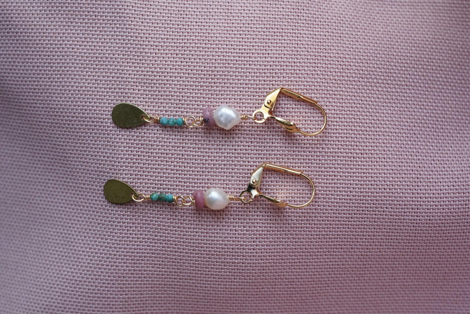 Deze unieke handgemaakte oorbellen zijn gemaakt van goldplated materiaal. Bij zuinig gebruik blijft de kleur behouden. En bevat de edelstenen roze jasper en turkoois.