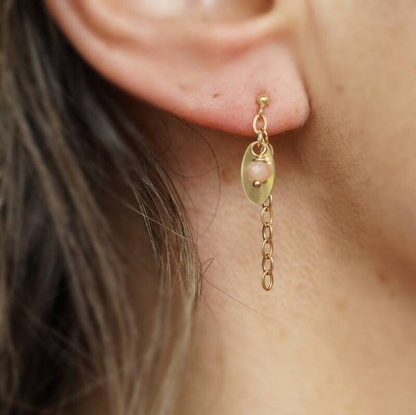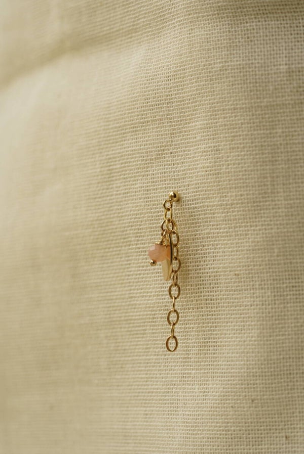 Een hele toffe 14k gold filled single oorbel met een oranje maansteentje. Je kunt hem leuk combineren met andere oorbellen. Bv met Doortrek oorbel bergkristal. Een echte eyecather!