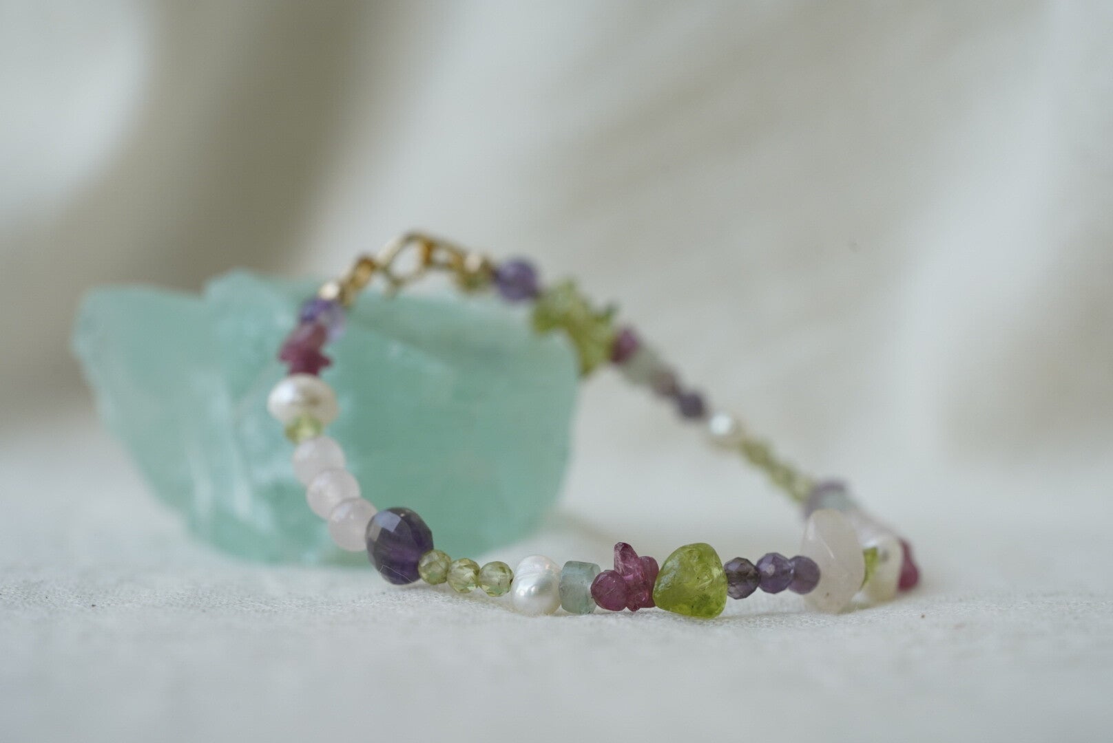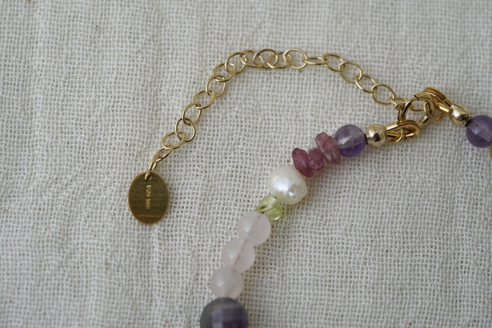 Een vol edelstenen armband afgewerkt met een gold filled slotje en verlengstuk. Dit armbandje bevat de edelstenen amethyst, peridot, roze tourmalijn, aventurijn, zoetwaterparel en rozenkwarts.
