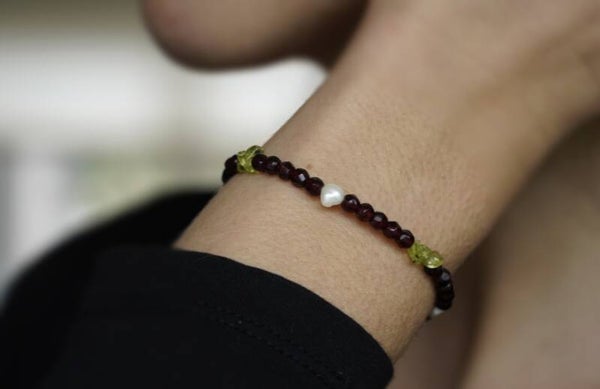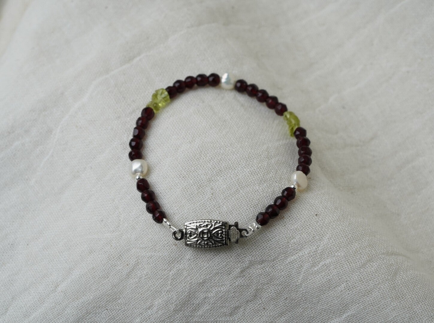 Het begon met een antieke zilveren metalen bakslotje... Gekozen voor de klassieke uitstraling met granaat, peridot en zoetwaterparel. Wat een lief armbandje is het geworden! Het is er wel één voor de slanke pols.