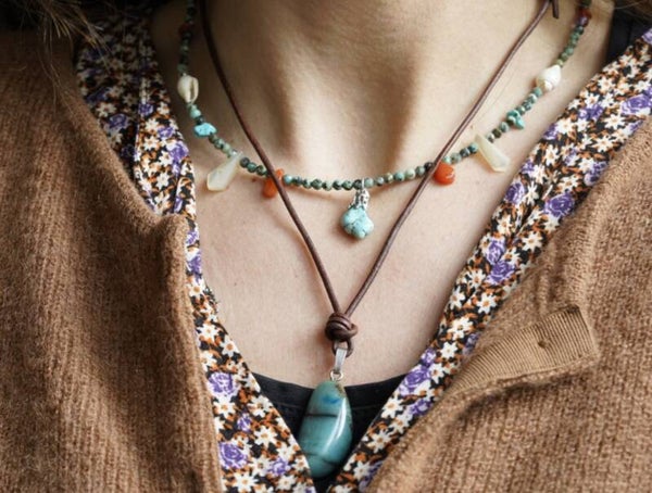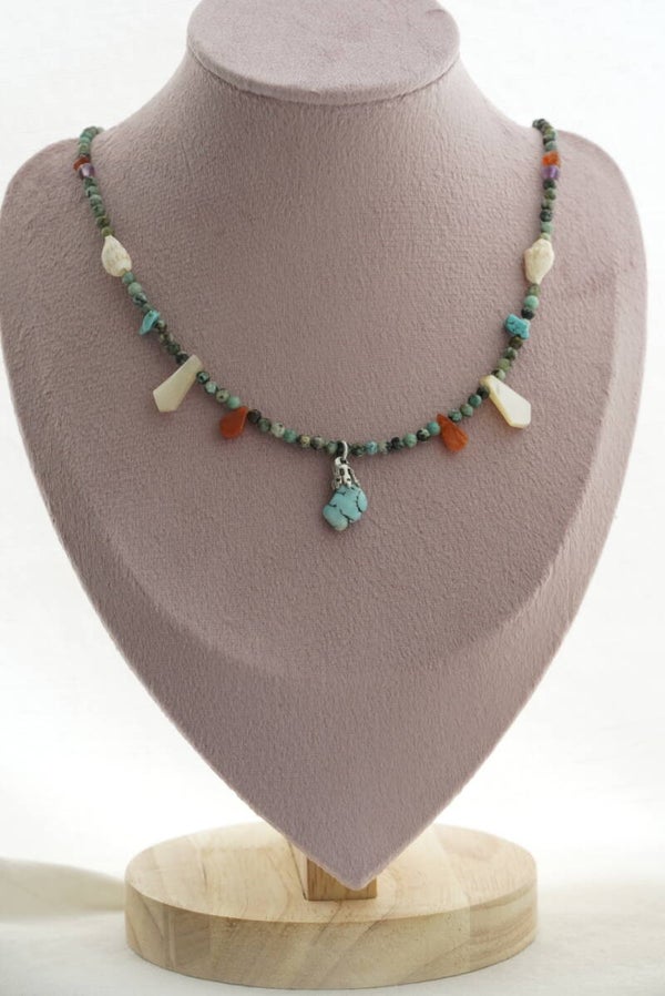 Een zomerse ketting in boho style. Super leuk te dragen met een zomers jurkje of tuniekje. De ketting is gemaakt met turkoois, oranje agaat, schelpen, amethyst en carneool. Deze ketting is ook heel leuk te layeren met andere kettingen.