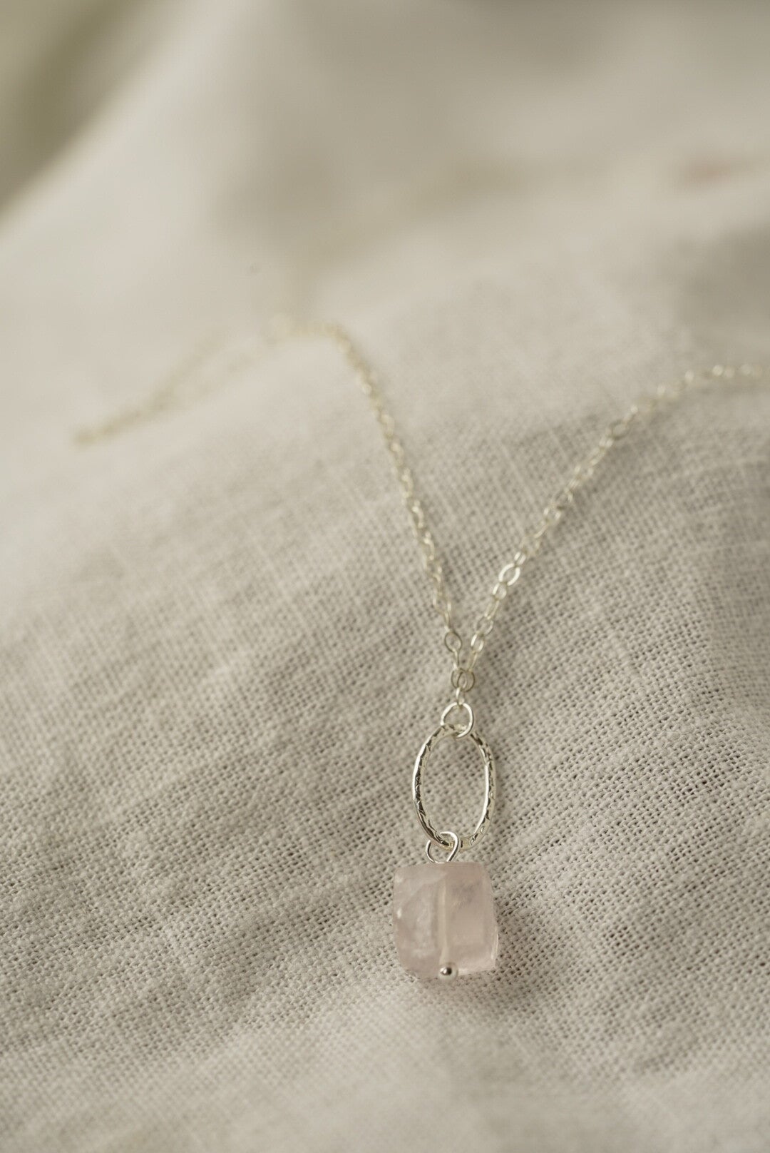 Een prachtige stijlvolle sterling zilveren ketting met een hanger van facetgeslepen rozenkwarts. De bedeln zit vast in een schakeltje, hierdoor zal het slotje nooit naar voren komen. De ketting is afgewerkt op z'n 'dirubinetti's'.