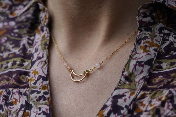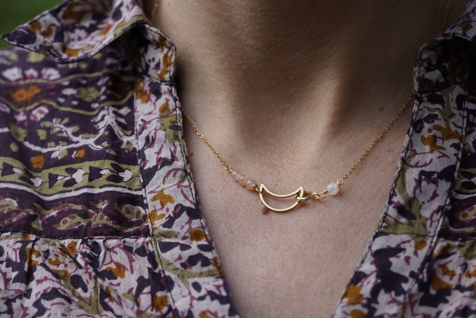 Een ketting van stainless steel met een maanbedel (maan = luna in het italiaans). Aan de linker kant zie je een regenboogmaansteentje en aan de rechterkant zie je 3 perzikmaansteentjes op een rij. Het slotje is goldplated.