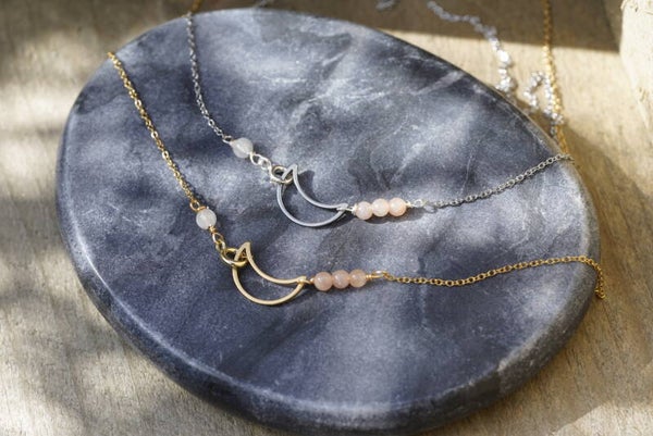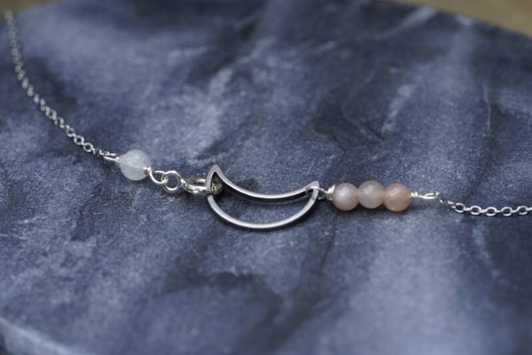 Een ketting van stainless steel met een maanbedel (maan = luna in het italiaans). Aan de linker kant zie je een regenboogmaansteentje en aan de rechterkant zie je 3 perzikmaansteentjes op een rij. Het slotje is silverplated.