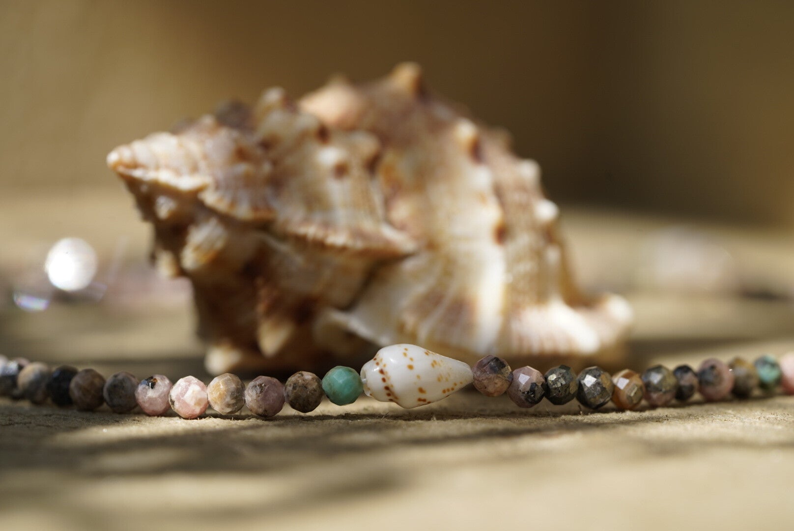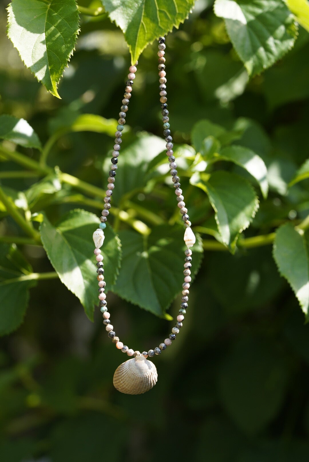 Deze ketting is gemaakt van rhodoniet facetsteentjes, met hier en daar een turkoois steentje. Dit breekt het geheel. In het midden een schelp, deze gevonden op het strand in Bloemendaal. Er zat een gaatje in, dus daar een toffe hanger van kunnen maken. De ketting is afgewerkt met guardian wire en een silverplated slotje.