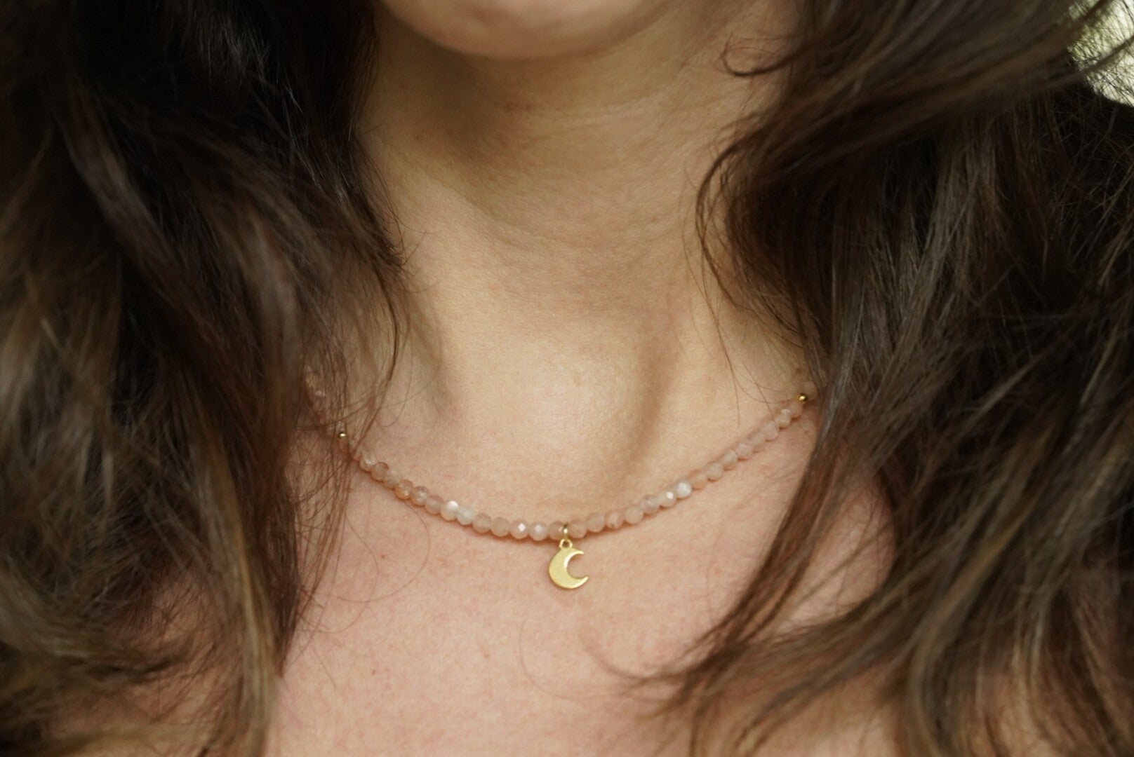 Een ketting met oranje maansteen facetsteentjes, afgewerkt met een goldplated slotje. In het midden hangt een stainless steel maantje. Tijdloos en overal bij passend.