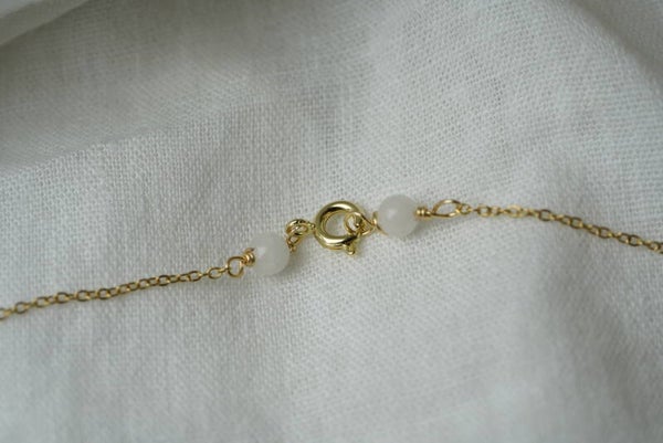 Een ketting van stainless steel met op een speelse wijze regenboogmaansteen verwerkt. Nét iets boven het sleutelbeen. Dit maakt de ketting origineel. Sluiting afgewerkt op z´n "di rubinetti's" met een goldplated slotje.