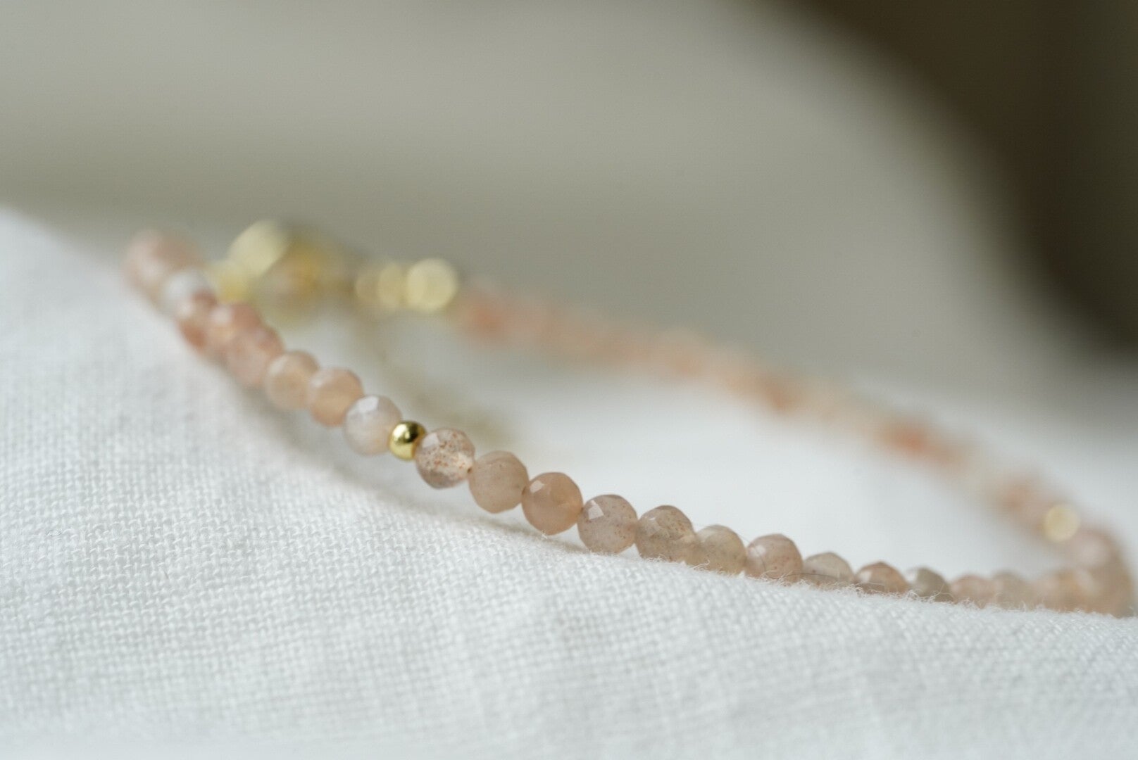 Een armband met perzik maansteentjes in facetvorm. Afgewerkt met een stainless steel verlengstukje.