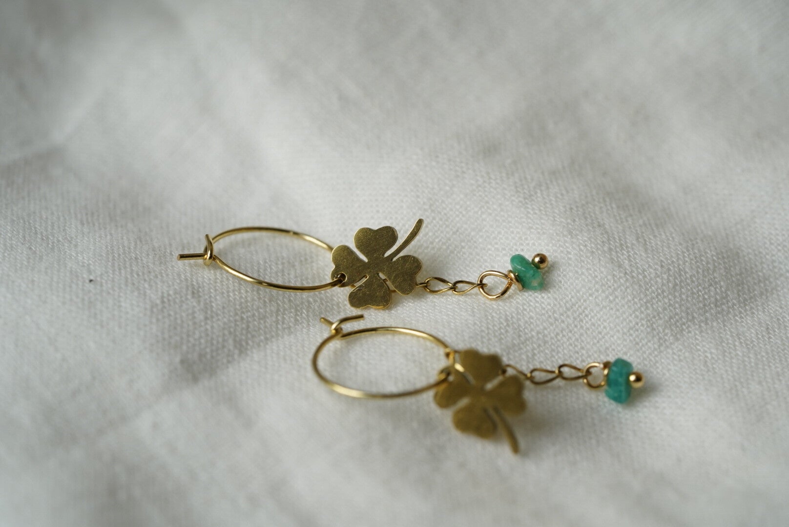 Wauw dit zijn leukerds! Stainless steel hoops met een klavertje vier gecombineerd met een amazoniet steen. Die blauwe kleur knalt en dat gecombineerd met het lieve van het klavertje vier. De volledige hanger is van stainless steel.