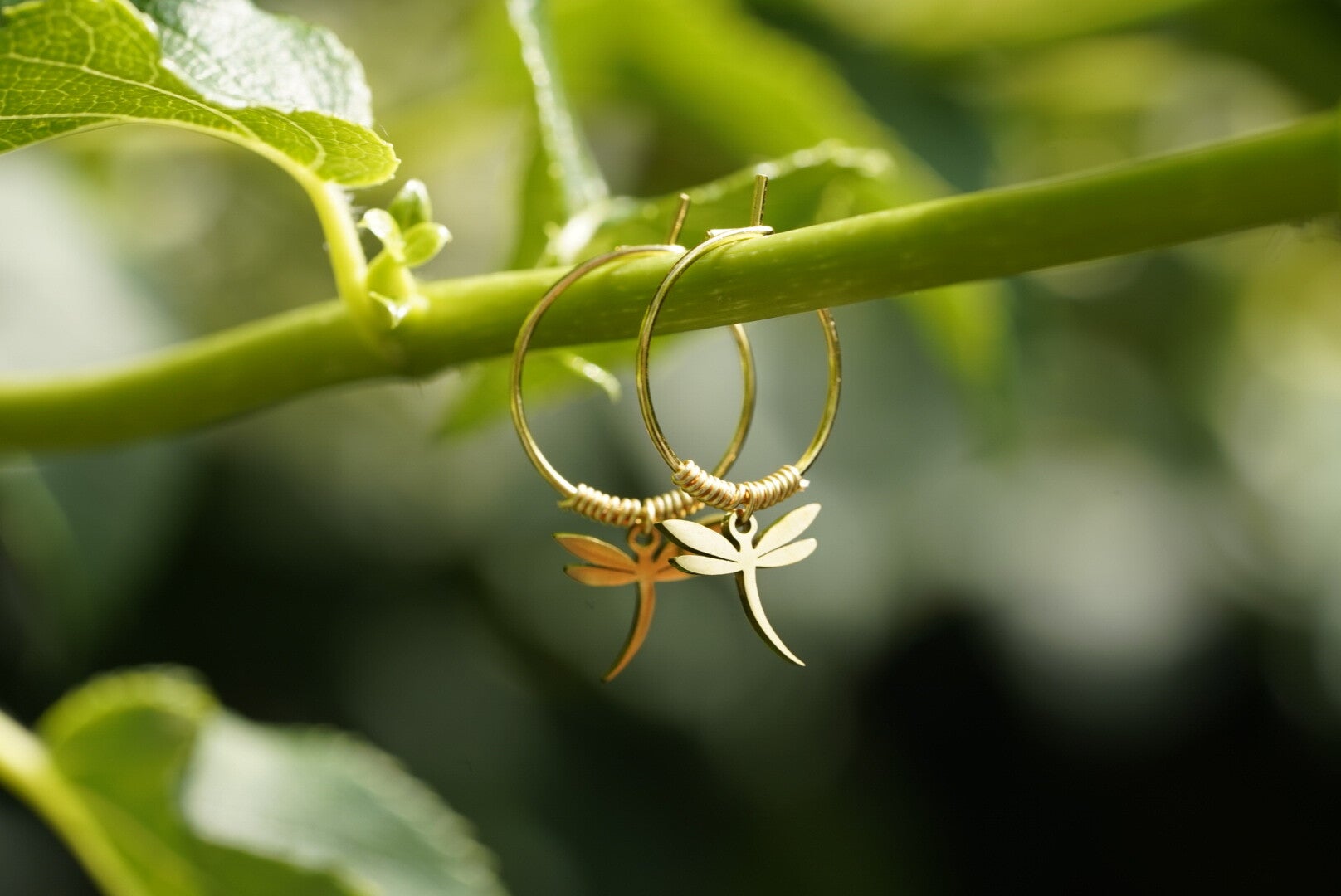 Stainless steel hoops met een libelle hanger, vast gedraaid met goldplated draad. Ziet er stoer en tof uit toch?