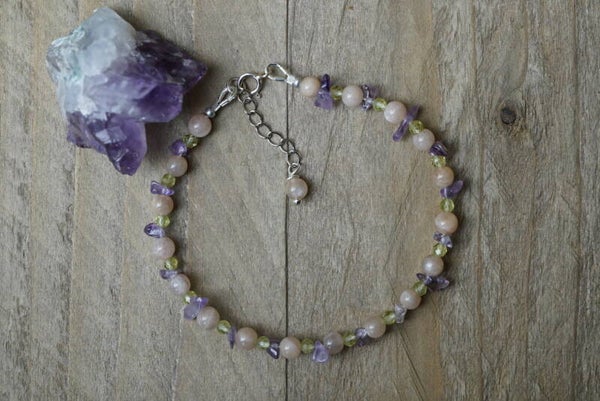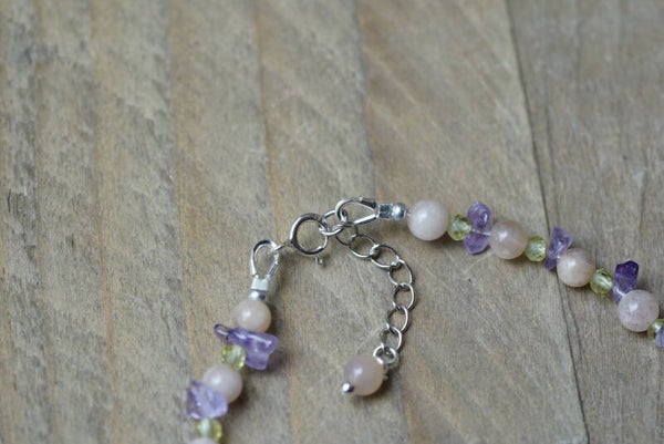Een edelstenen armband op een speelse wijze samen gesteld met amethyst chipsteentjes, maansteen en peridot facetsteentjes. Zo mooi hoe deze kleuren samen komen. Slotje is van echt zilver.