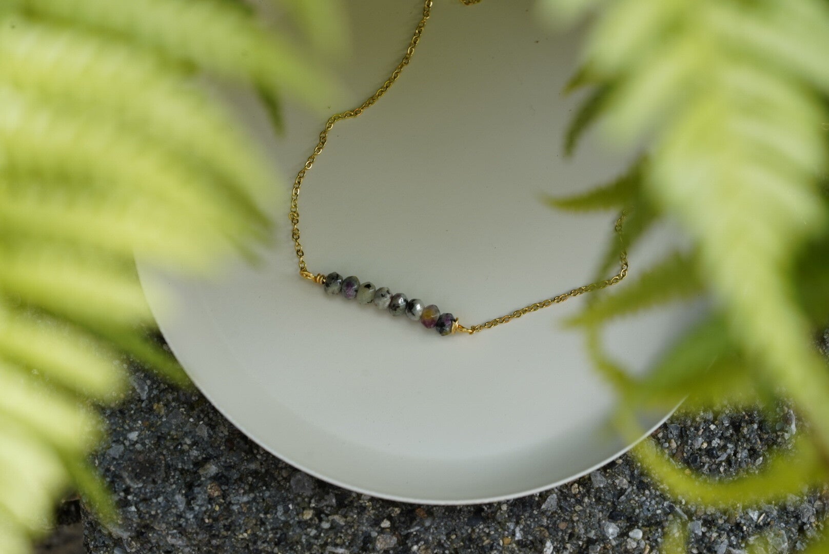 Een stainless steel ketting met een bar van jasper facetsteentjes. Afgewerkt met een goldplated slotje.