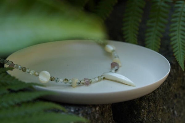 Parelmoer is een glanzend materiaal dat afkomstig is van de binnenkant van schelpen en geeft de ketting een mooie, iriserende glans.