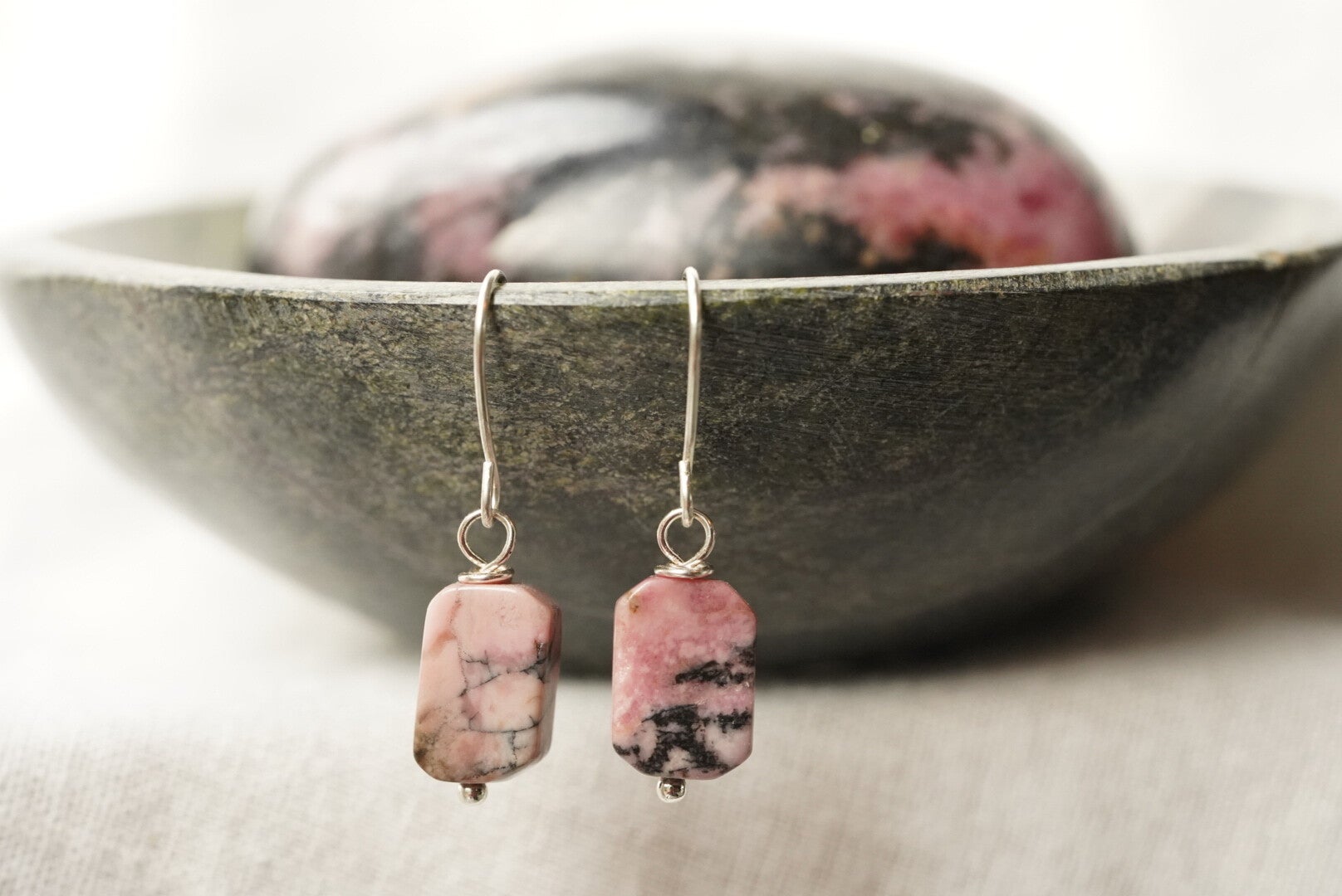 Prachtige zilveren oorbellen met rhodoniet stenen, gemaakt van duurzaam stainless steel. Rhodoniet staat bekend om zijn helende werking, het bevordert emotioneel evenwicht en helpt bij het herstellen van negatieve energie.