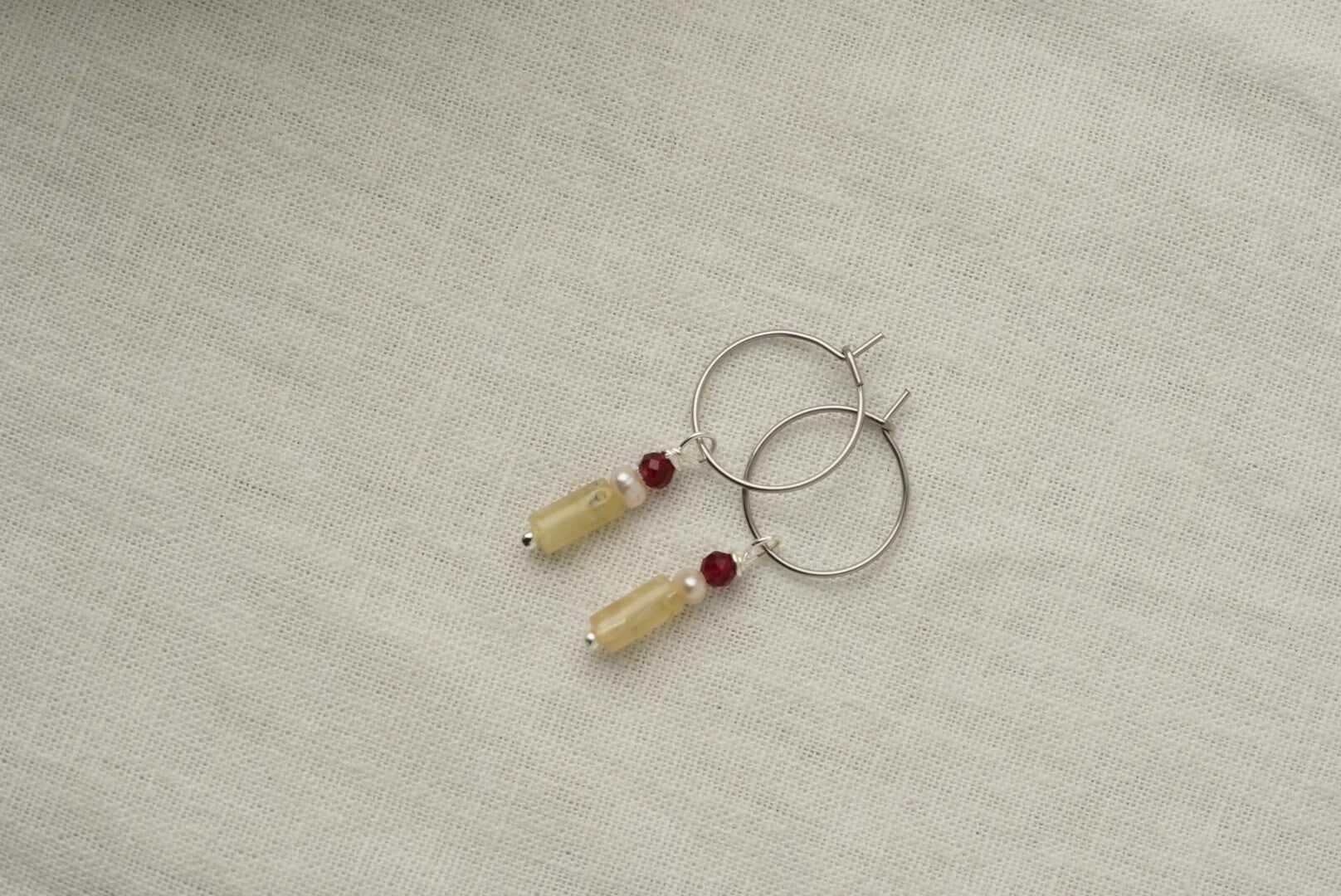 Deze oorbellen combineren de tijdloze schoonheid van zilver met de natuurlijke pracht van edelstenen. De hangers zijn vervaardigd uit fluoriet, robijn en zoetwaterparel – stuk voor stuk krachtige symbolen van schoonheid en energie.