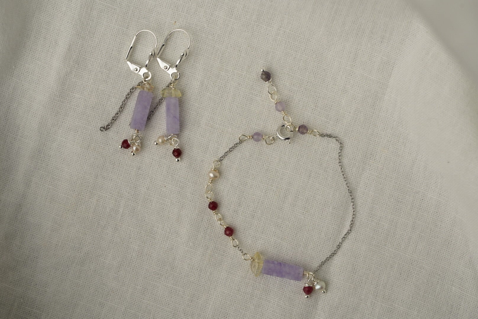 Voeg een vleugje luxe toe aan je accessoires met deze handgemaakte zilverplated oorbellen. De verfijnde amethyst tube is prachtig gecombineerd met de warme gloed van citrien, de glans van een zoetwaterparel en de diepe tint van robijn. Deze unieke oorbellen zijn perfect voor elke gelegenheid, van een avondje uit tot een bijzonder evenement.