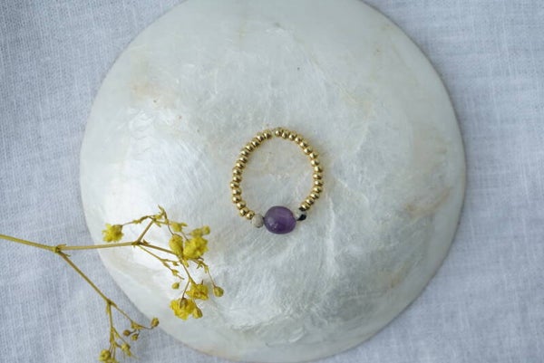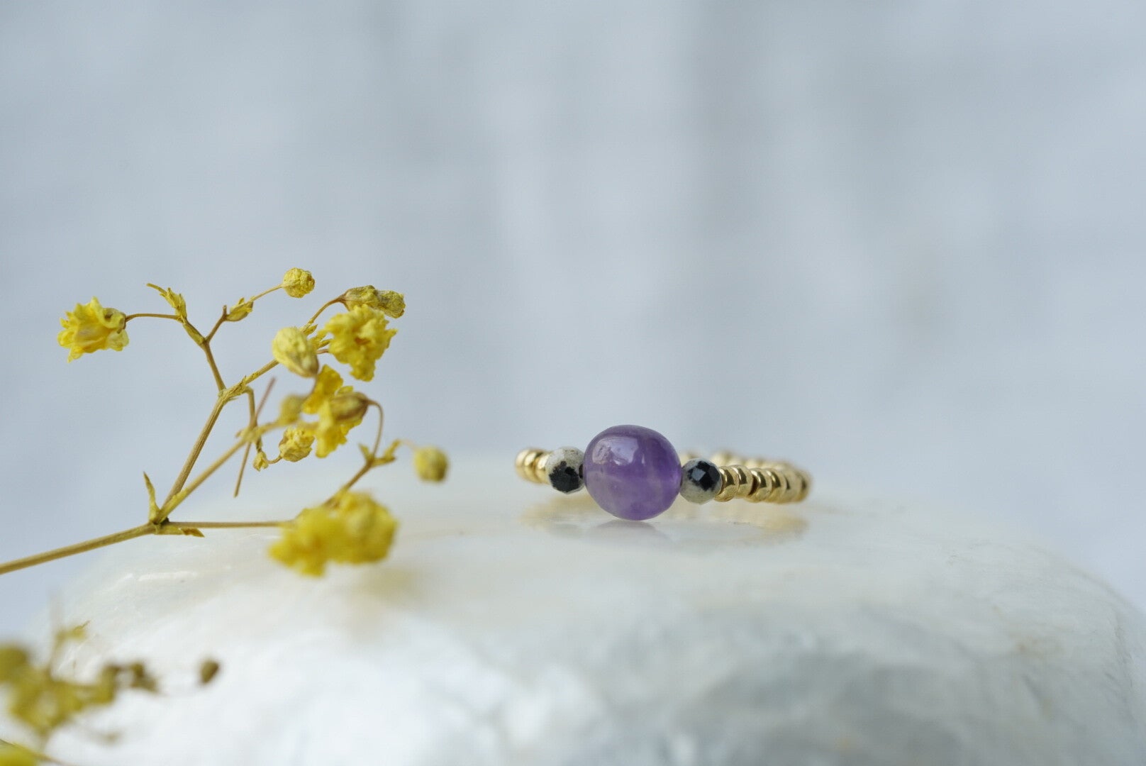 Amethist staat voor rust, bescherming en spirituele helderheid, terwijl dalmatiër jaspis vaak geassocieerd wordt met vreugde en speelsheid. Die twee samen creëren echt een balans tussen sereniteit en plezier. Het elastiek maakt de ring comfortabel en flexibel om te dragen.