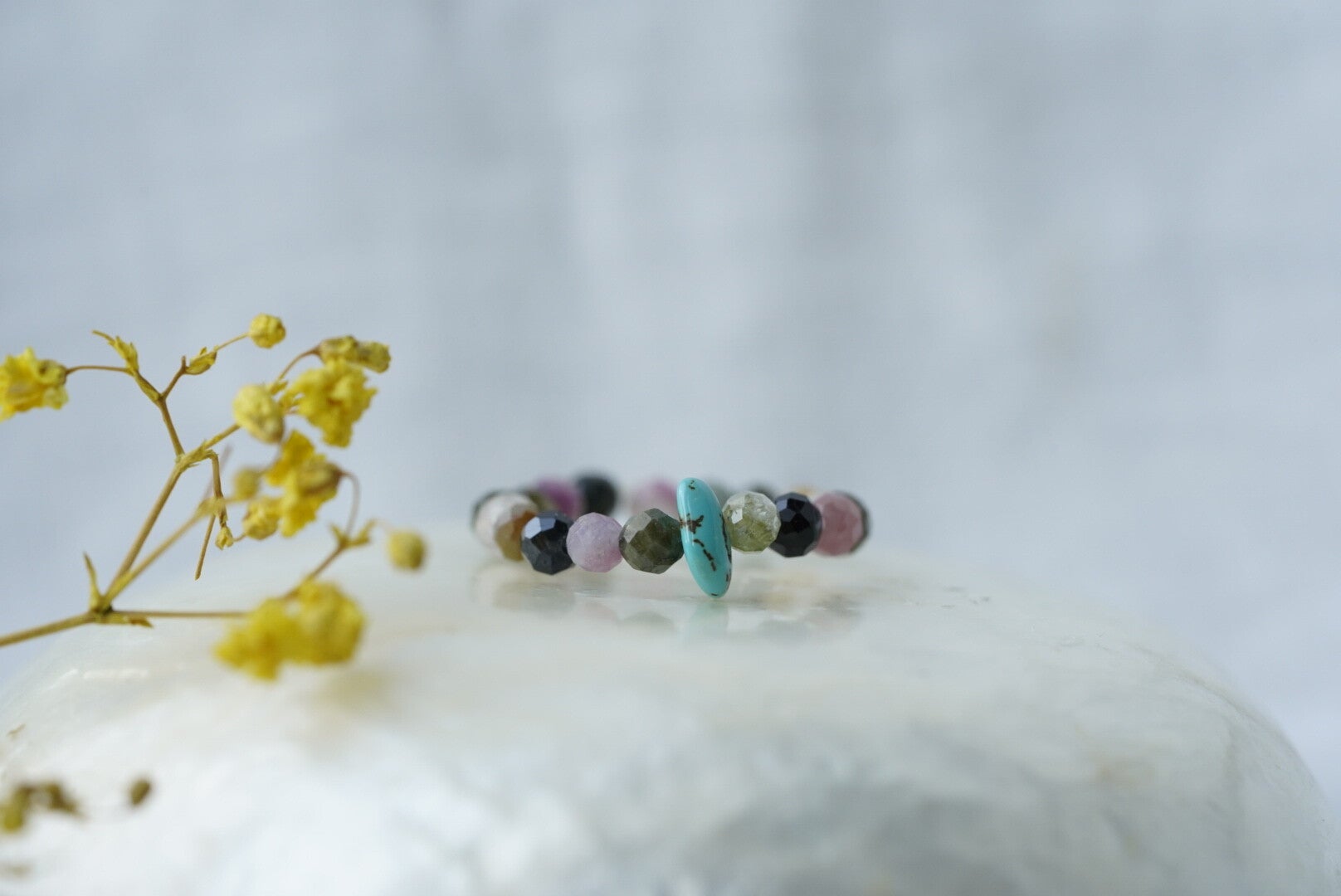 Tourmalijn heeft vaak een beschermende en aardende energie, terwijl turkoois bekend staat om zijn kalmerende en genezende eigenschappen. Samen hebben ze een prachtige balans van bescherming en rust, en de kleurencombinatie is natuurlijk ook een mooie mix van diepgroen/zwart en levendig blauw. Het elastiek maakt de ring comfortabel en flexibel om te dragen.