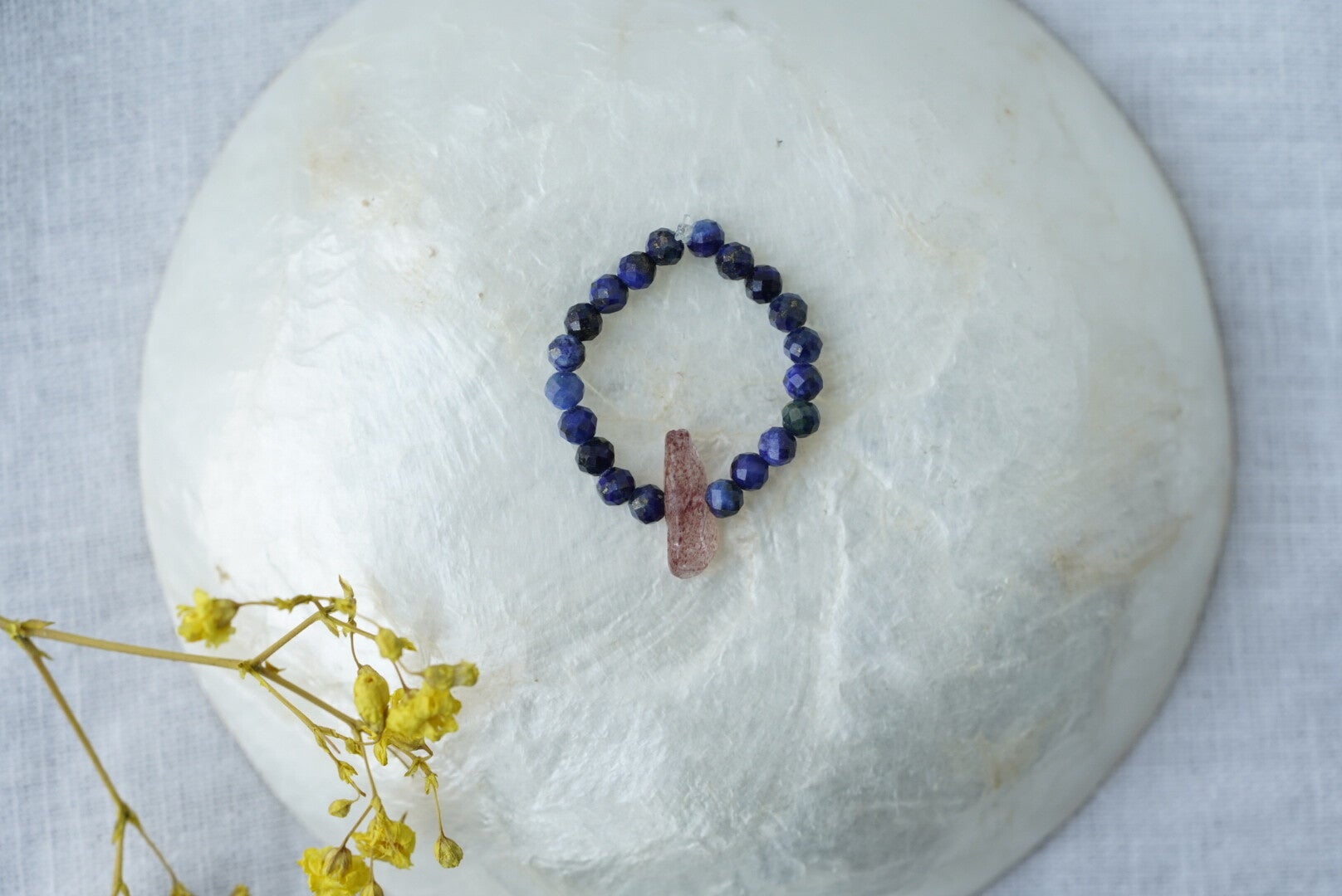 Lapis lazuli staat bekend om zijn diepe blauwe kleur en wordt vaak geassocieerd met wijsheid en communicatie, terwijl aardbeienkwarts die zachte roze tinten heeft en vaak geassocieerd wordt met liefde en emoties. Samen hebben ze een perfecte balans tussen intellect en hartenergie, wat het een mooie keuze maakt voor voor als je zowel innerlijke kracht als liefde zoekt. Het elastiek maakt de ring comfortabel en flexibel om te dragen.