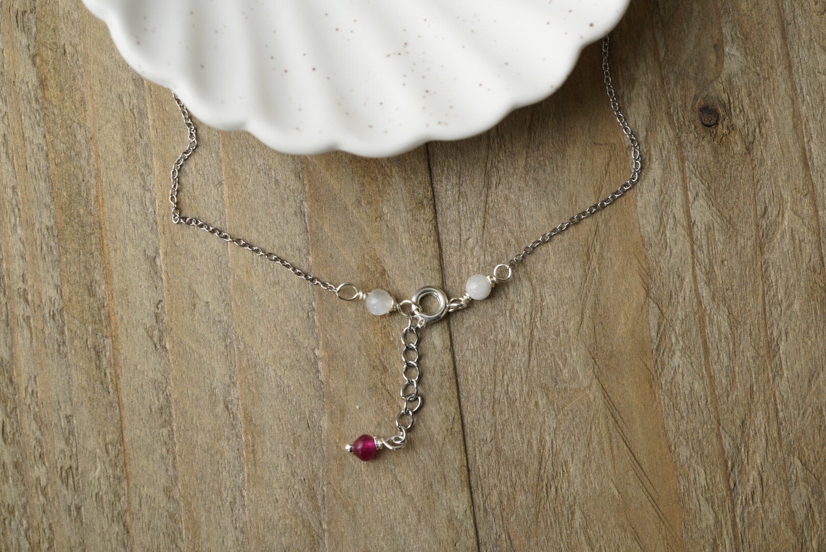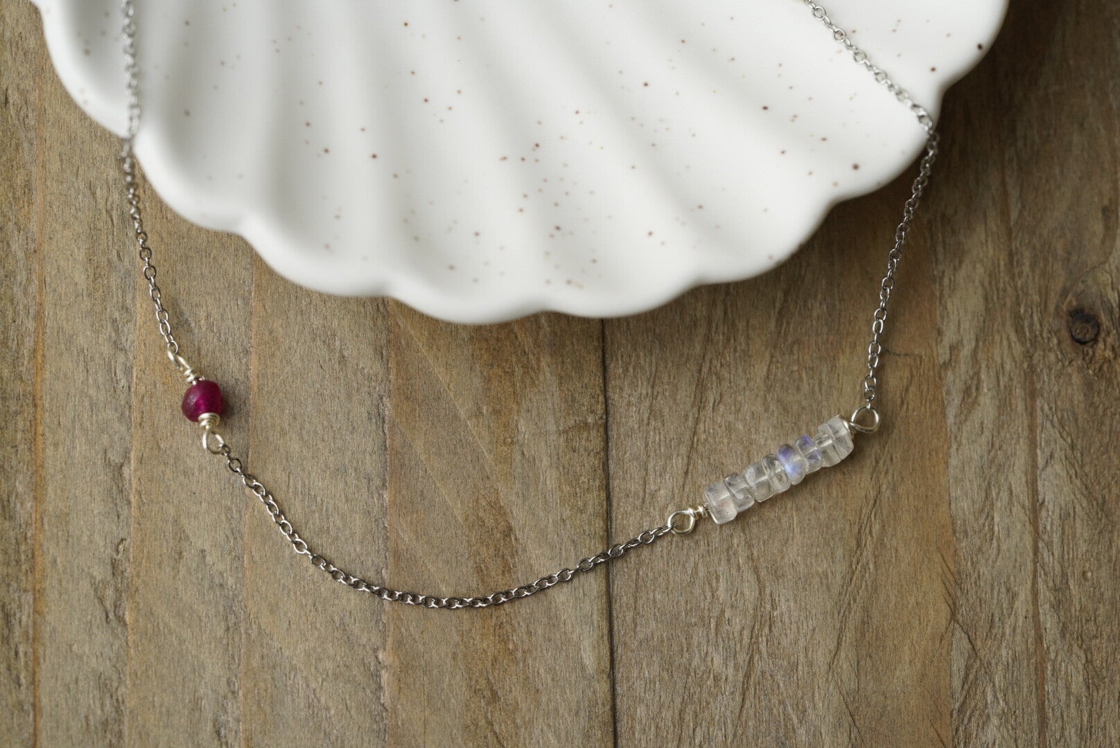Deze elegante stainless steel ketting combineert de kracht van regenboogmaansteen, robijn en chrysocolla. De regenboogmaansteen bevordert intuïtie, robijn staat voor passie en chrysocolla voor harmonie. Zie je die mooie blauwe glans van de maansteen?
