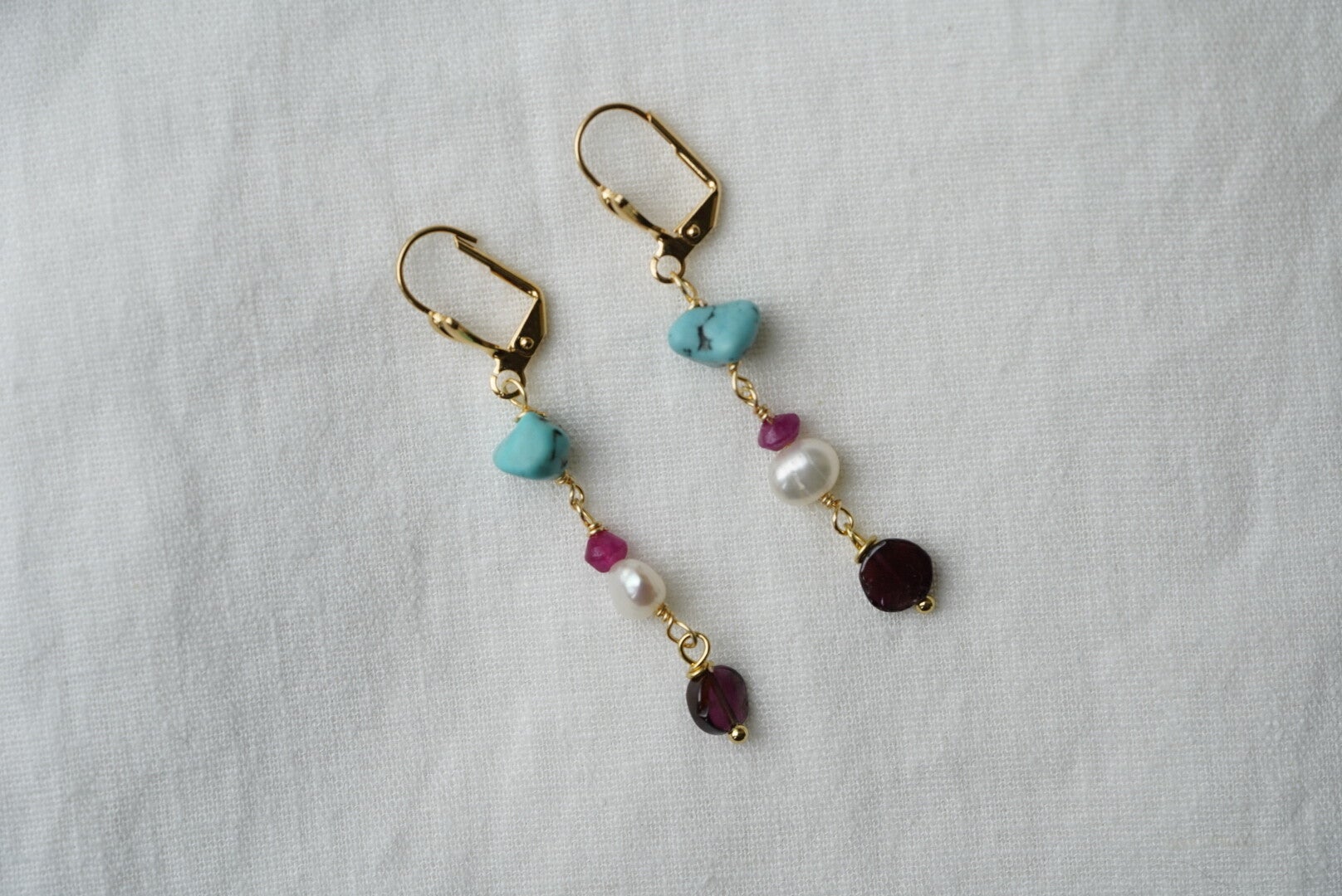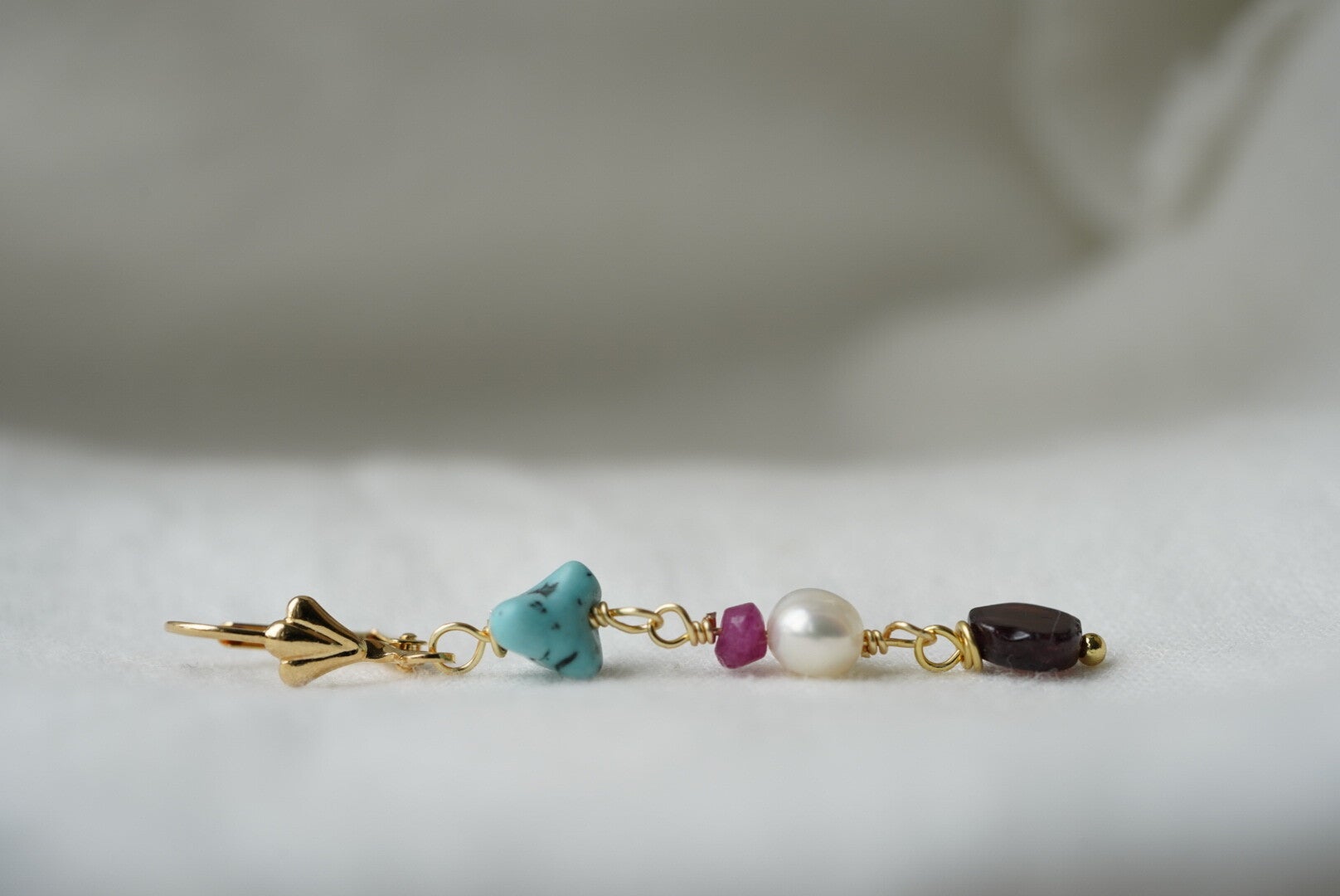 Deze schitterende goldplated oorbellen combineren de levendige energie van turkoois, robijn, parel en granaat. Turkoois biedt bescherming en balans, robijn brengt passie, parel staat voor sereniteit, en granaat versterkt vitaliteit en liefde.