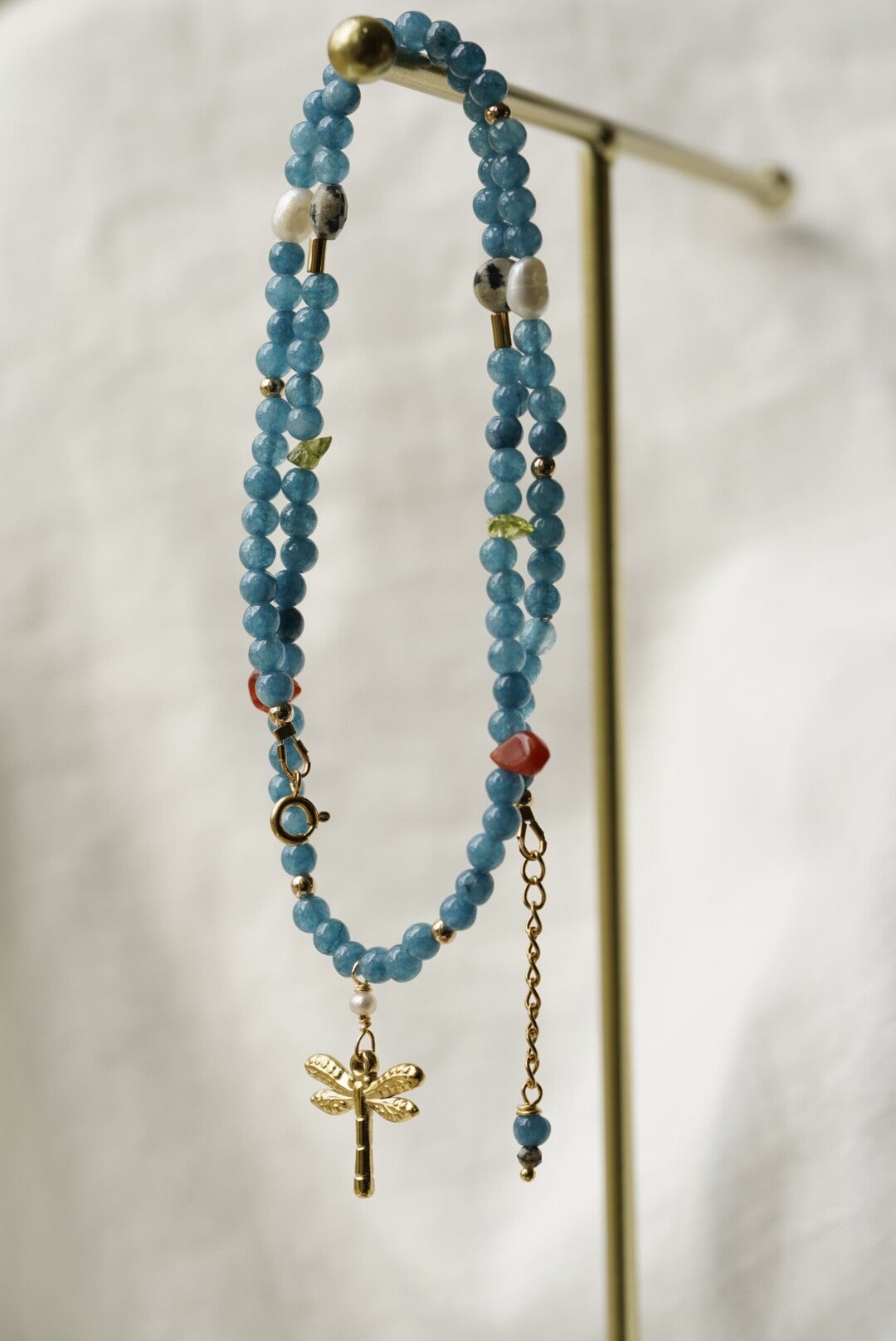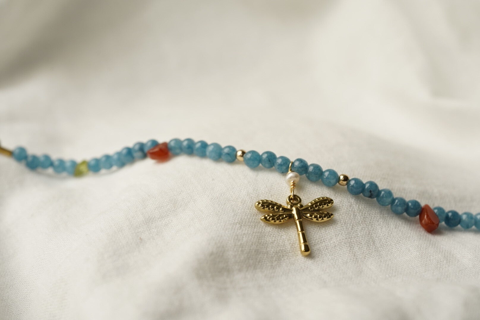 Deze unieke combinatie is afgewerkt met een hoogwaardig stainless steel slotje en een elegante libelle hanger van roestvrij staal (RVS) – symbool voor transformatie en lichtheid.