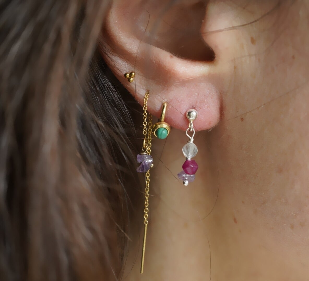 Op zoek naar een verfijnd, stijlvol en betekenisvol oorbelletjes? Deze met liefde handgemaakte oorknopjes van 925 sterling zilver, elk ingelegd met drie krachtige edelstenen: