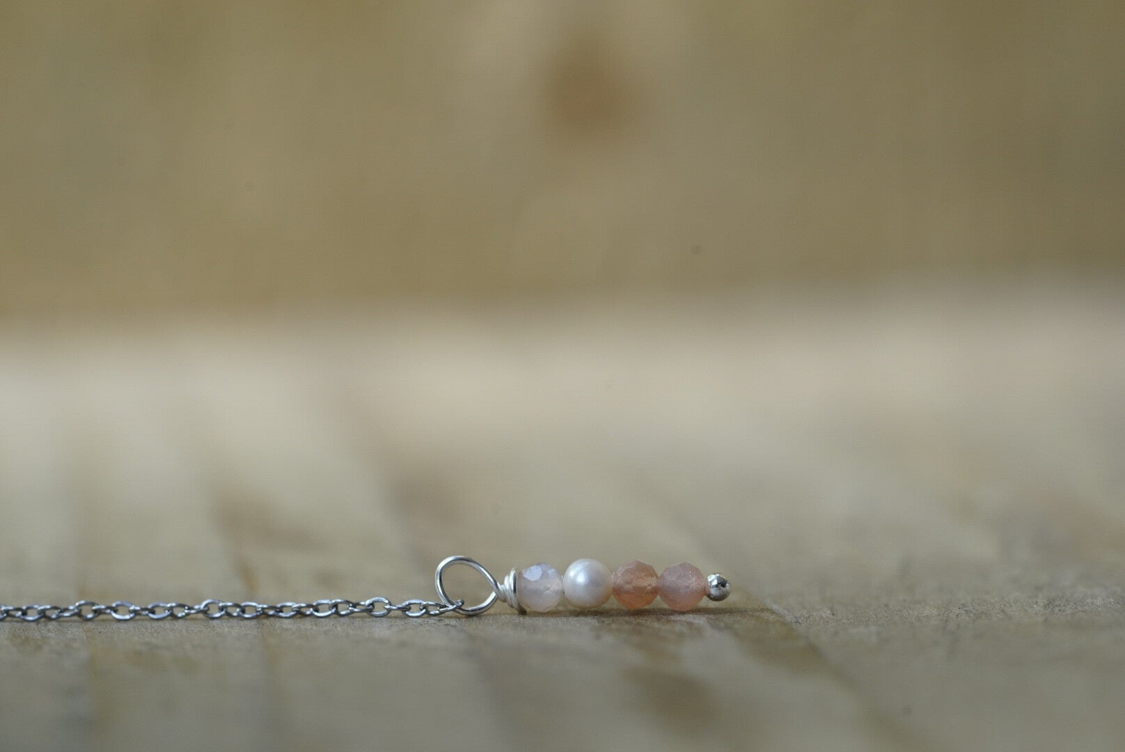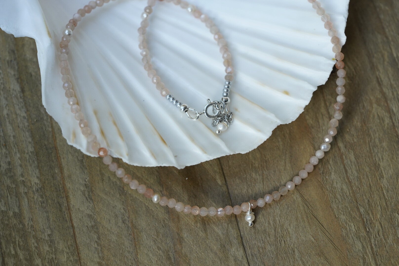 Deze handgemaakte ketting is een unieke combinatie van natuurlijke schoonheid en duurzame materialen. De warme gloed van oranje maansteen wordt prachtig aangevuld door de zachte glans van echte zoetwaterparels.