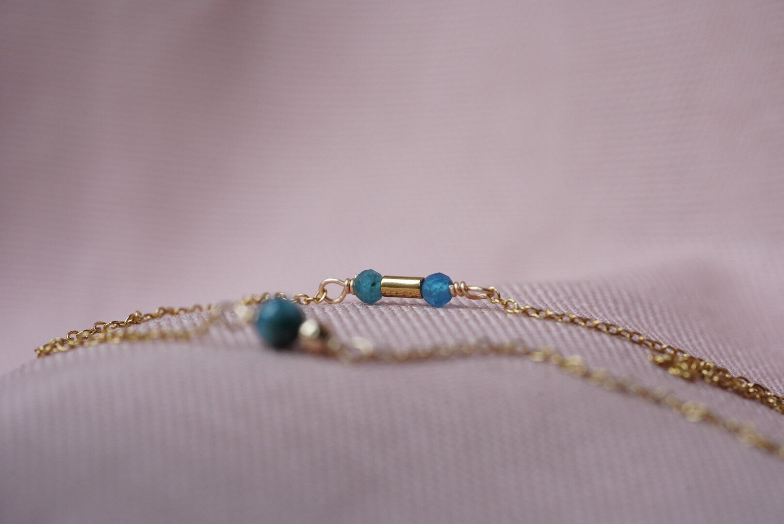 Het middelpunt is een prachtige witte Jade donut, afgewerkt met apatite steentjes voor een subtiele, unieke touch. Bij het slotje regenboog maansteen toegevoegd.