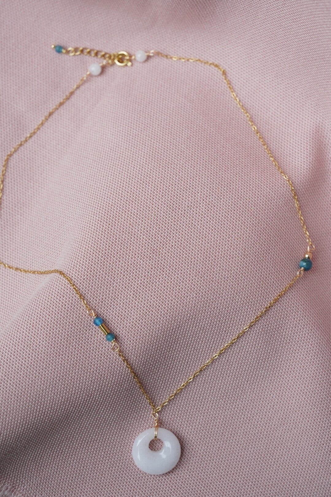 En nice to know, de witte Jade donut zit in een schakeltje vast, zo blijft de hanger altijd beneden en het slotje in je nek!