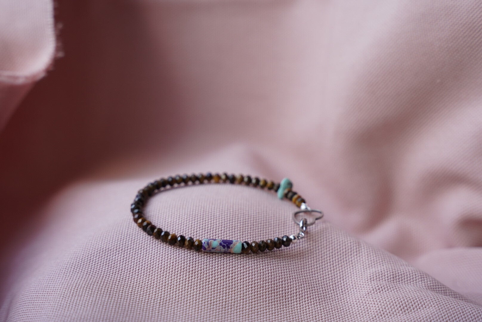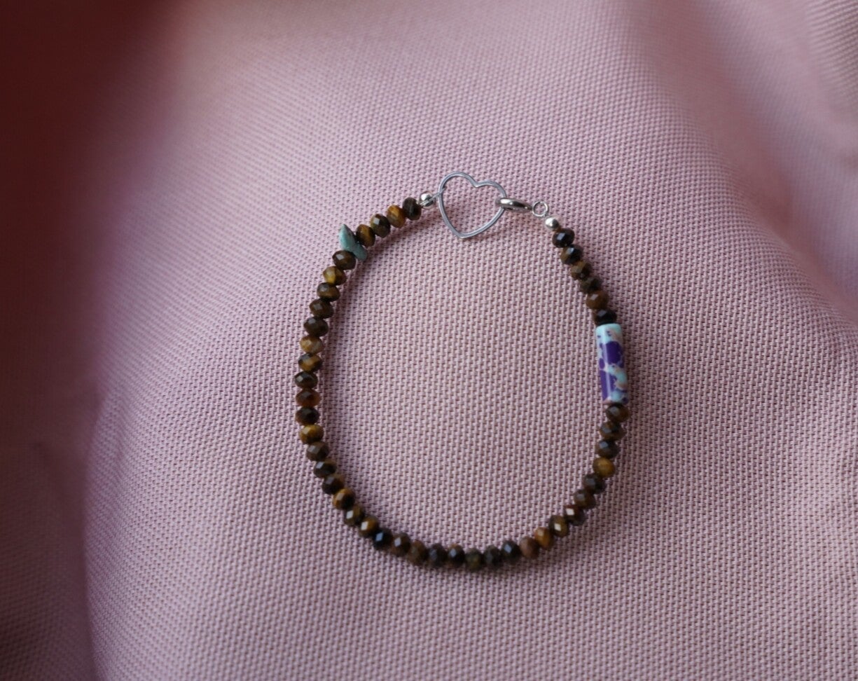 Deze elegante armband is met zorg handgemaakt en bestaat uit fijn geslepen tijgeroog kralen, één turkoois & gecombineerd met duurzame stainless steel details. De hartvormige stainless steel sluiting geeft het sieraad een liefdevolle en moderne uitstraling.