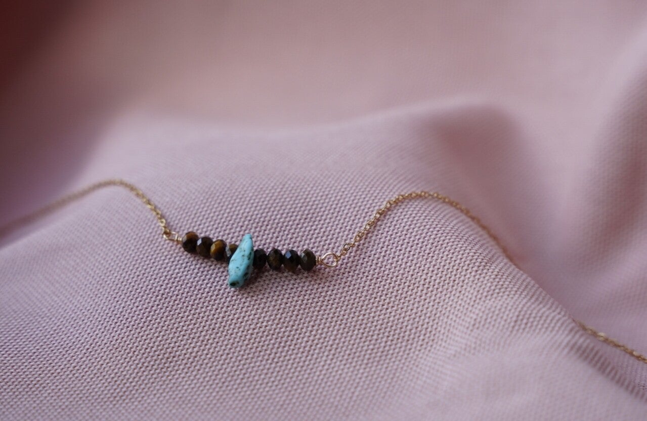 Deze verfijnde handgemaakte ketting is een subtiel maar opvallend sieraad. De fijne stainless steel ketting is gecombineerd met facetten van tijgeroog en een speels turkoois accentsteentje, wat zorgt voor een unieke en stijlvolle uitstraling.