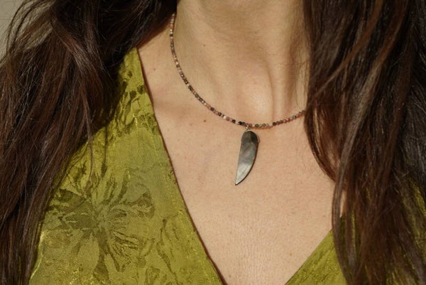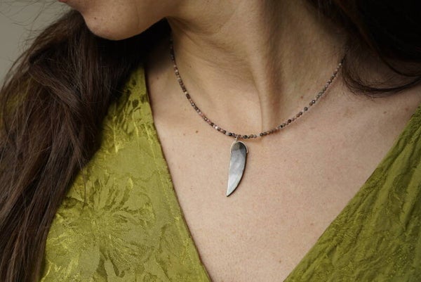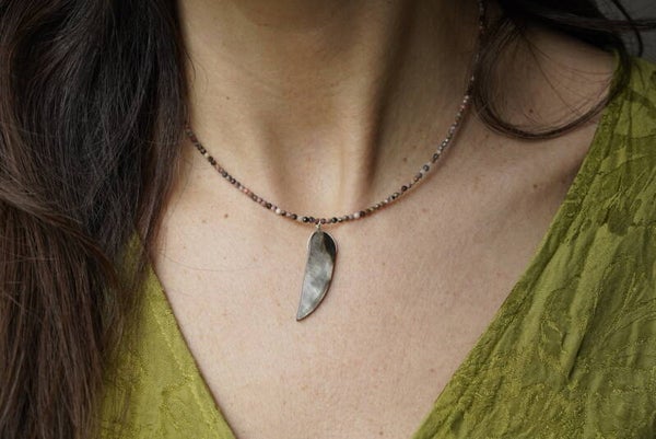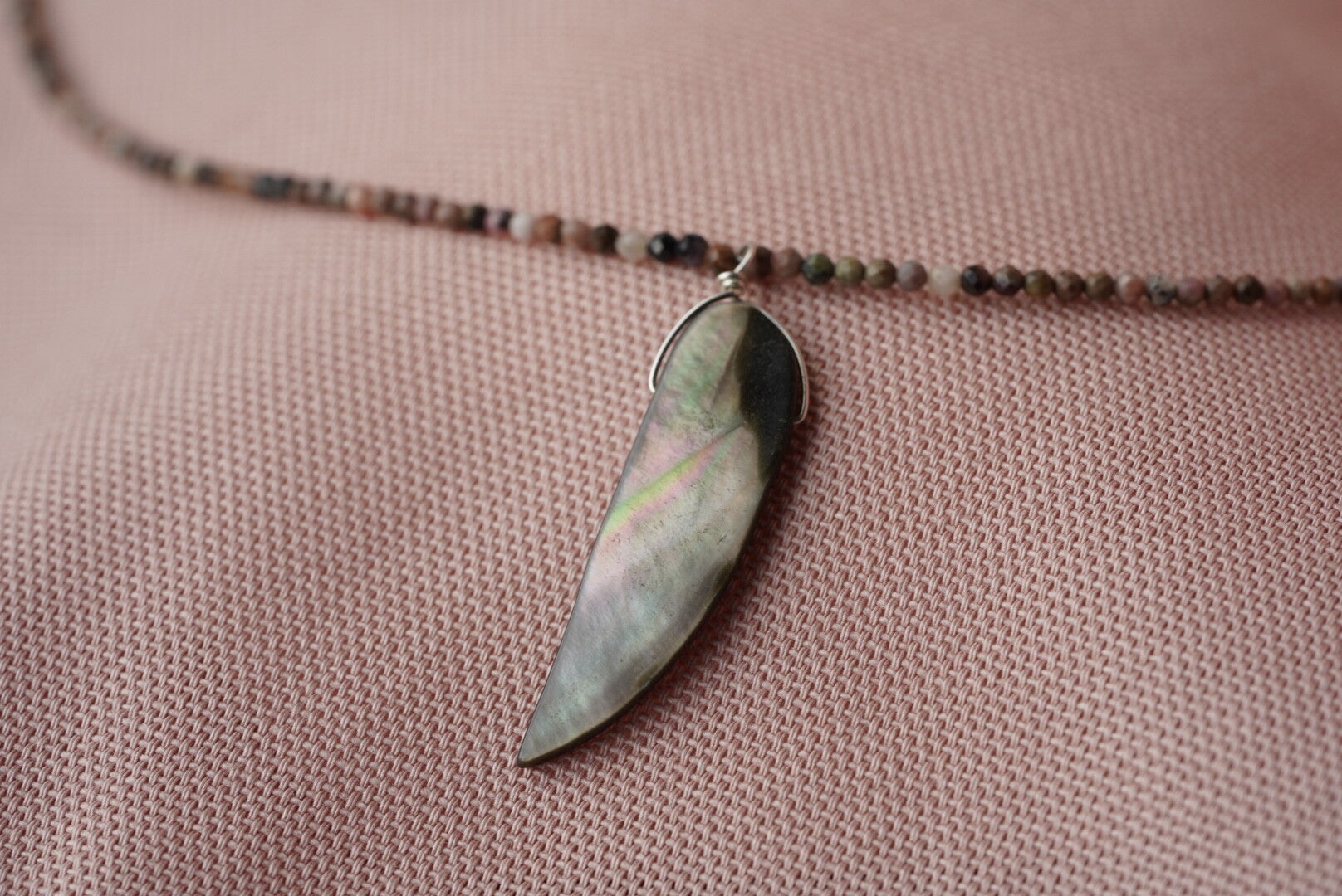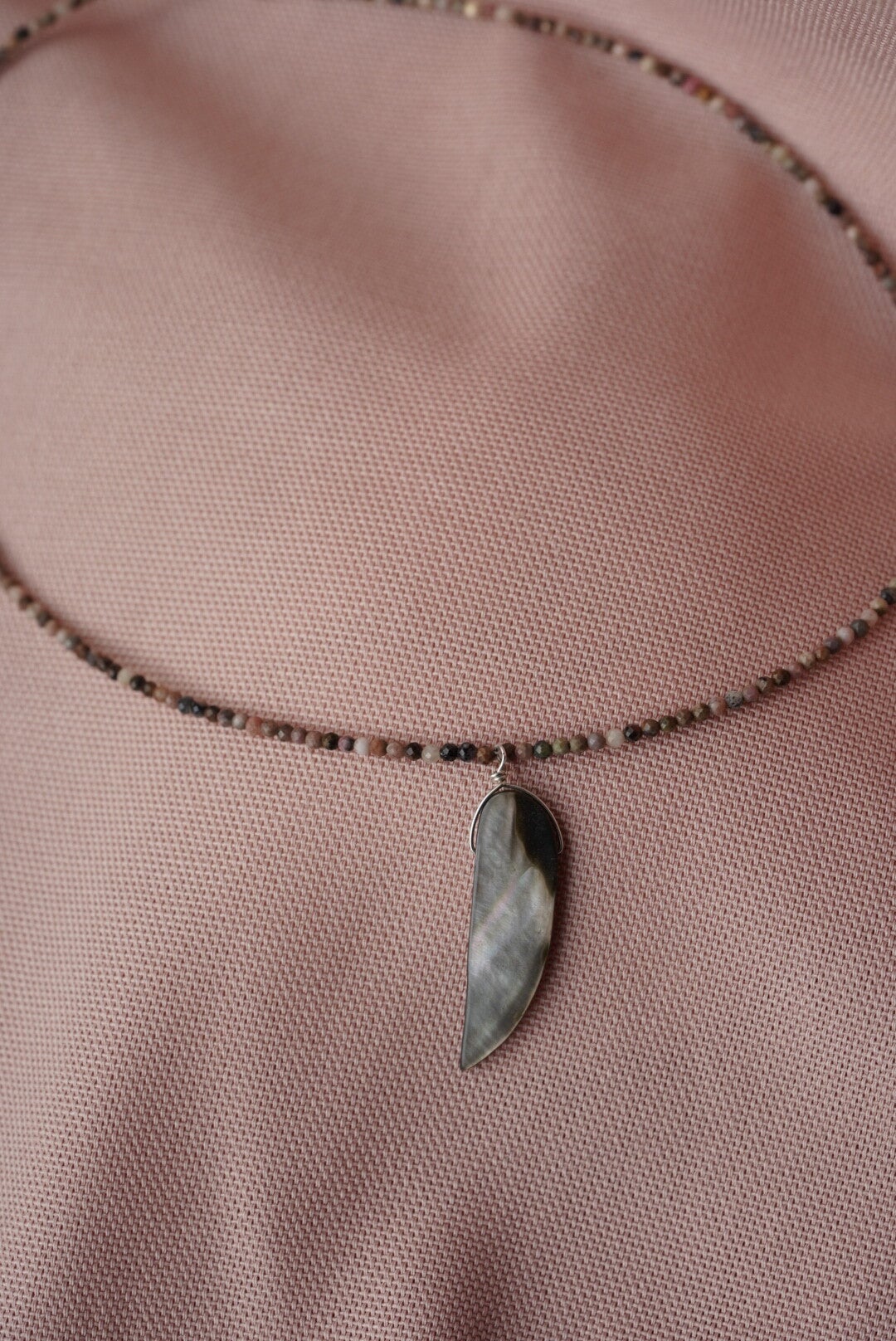 Prachtige handgemaakte ketting met gefacetteerde rhodoniet steentjes. De warme roze tinten van rhodoniet geven de ketting een elegante en natuurlijke uitstraling. In het midden hangt een bijzondere hanger van een abalone schelp, die schittert met mooie iriserende kleuren.