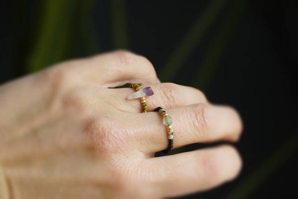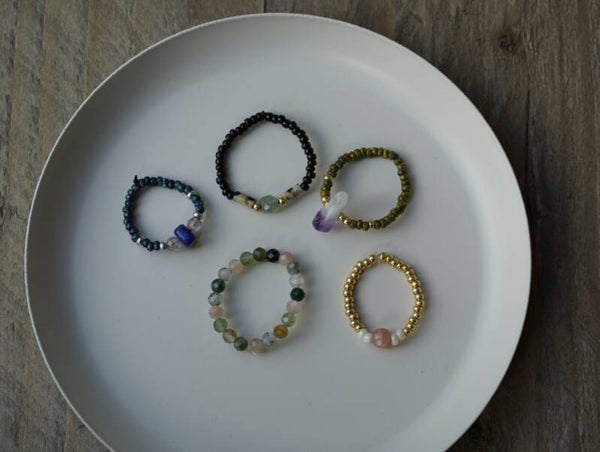 Een ringetje op elastiek met aventurijn en dalmation jaspis.